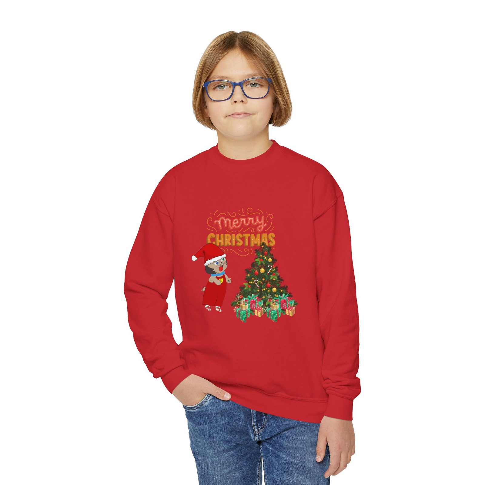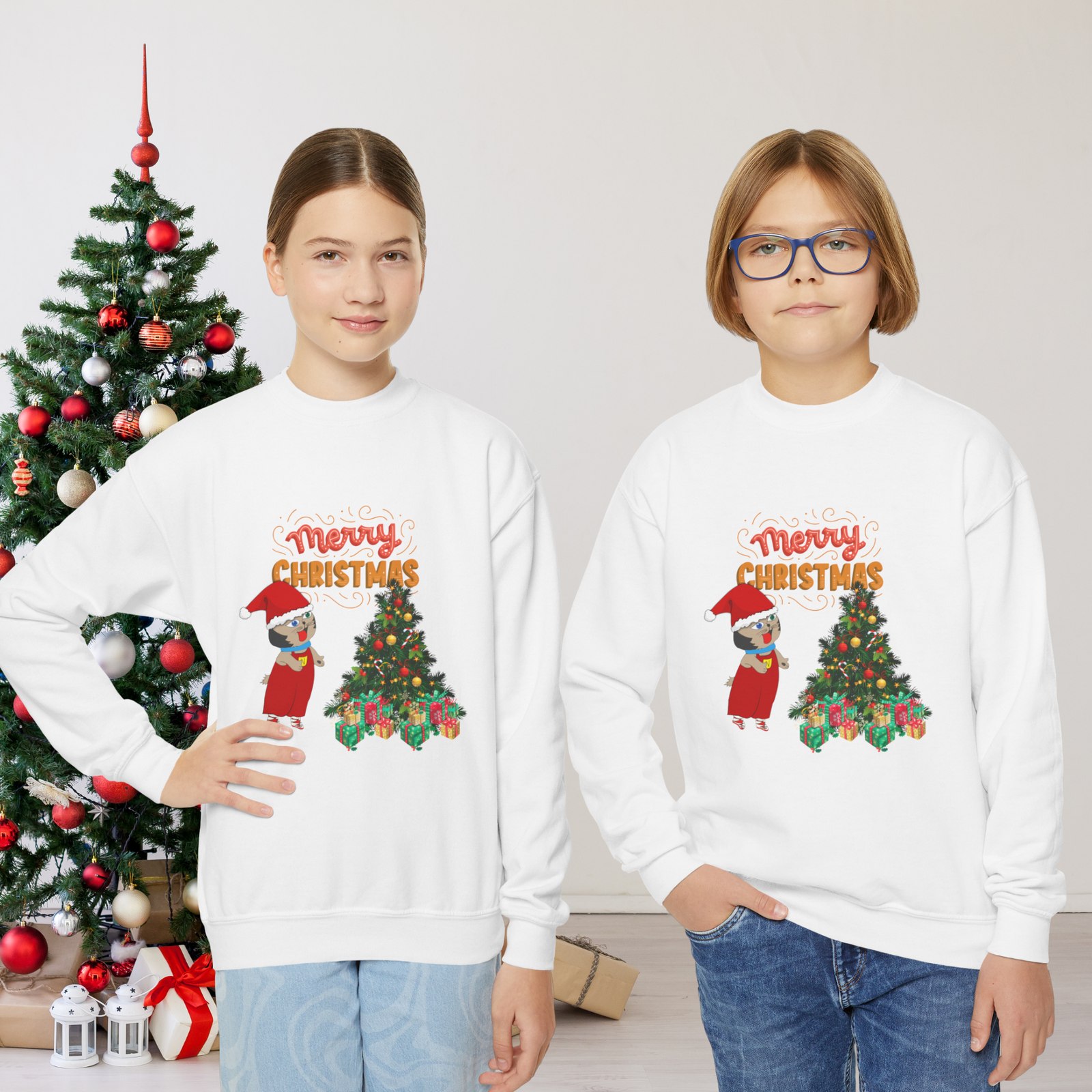 This youth sweatshirt featuring a festive design of Merry Christmas, Nekko’s Christmas, Christmas tree, and gift box, is perfect for spreading holiday cheer. It is a medium-heavy fabric with a loose fit, making it cozy and comfortable for kids to wear during the Christmas season. Ideal for children who love celebrating Christmas and receiving gifts.