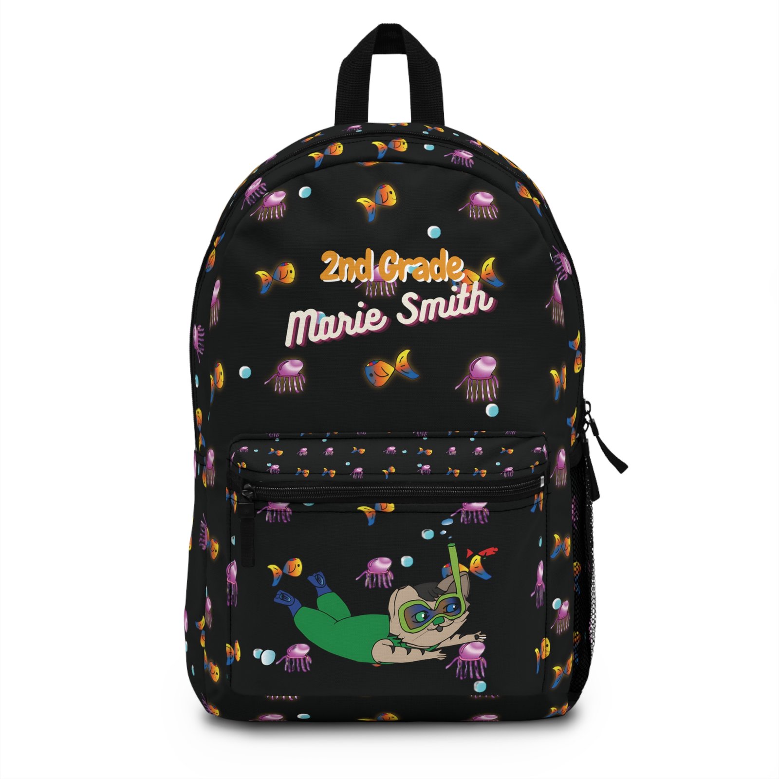 – **Detalles Creativos:** El diseño incluye detalles como burbujas, estrellas de mar y algas marinas que realzan la temática del cuento. Cada mochila es creada con precisión para capturar la magia del fondo del mar.