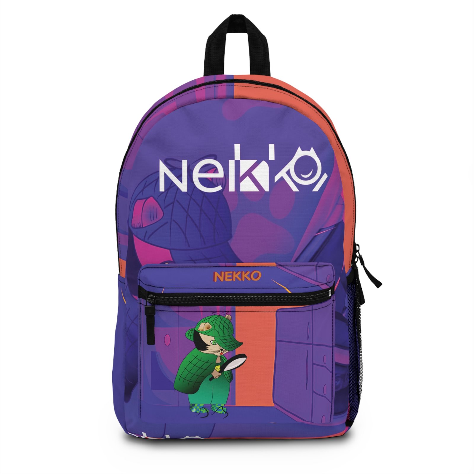 – **Detalles Creativos:** El diseño incluye detalles como huellas de patas, lupas y mapas que complementan el tema de detective. Cada mochila es producida con precisión para capturar la emoción de resolver misterios con Nekko.