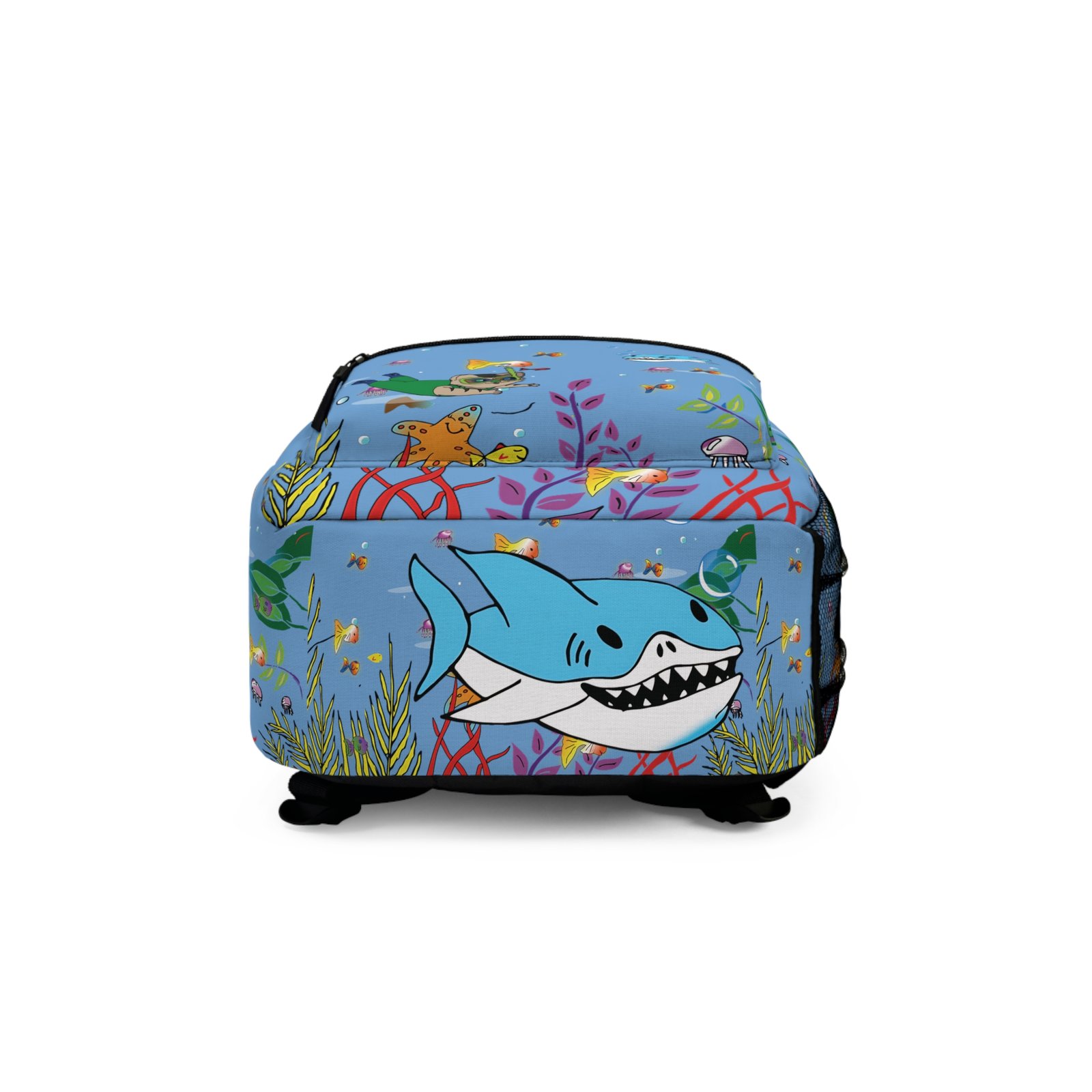 – **Detalles Creativos:** El diseño incluye detalles como burbujas, estrellas de mar y algas marinas que realzan la temática del cuento. Cada mochila es creada con precisión para capturar la magia del fondo del mar.